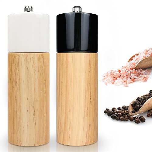 - 【FANCY PRESENT】 The classic bottle has the advantage that the streamlined ergonomic design is adopted, the holding operation is comfortable, and fits your hands perfectly. The natural wood pepper grinder mill with black and white lid can adapt to any furniture style. These wooden salt and pepper mills will be a fancy and elegant decoration in the kitchen. Also as an ideal gift for your family and friends for Birthday, Valentine’s Day, Mother’s Day, Wedding, Anniversary, or housewarming.